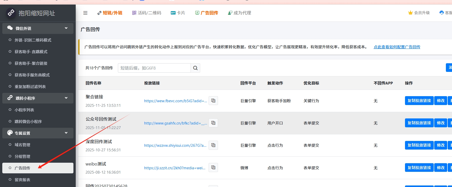 需要做广告回传的链接,都需要预先配置广告回传链接,详细操作步骤